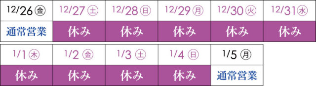12/27~1/4は誠に勝手ながらお休みをいただくため営業形態が異なります。