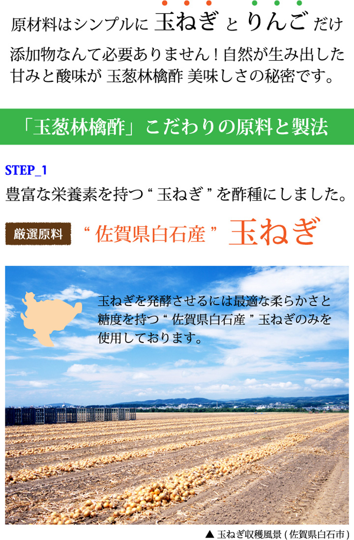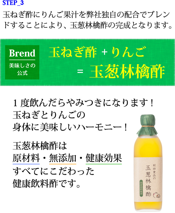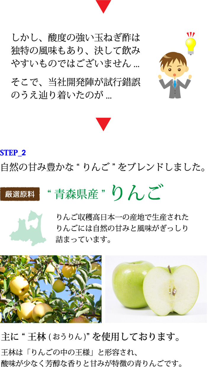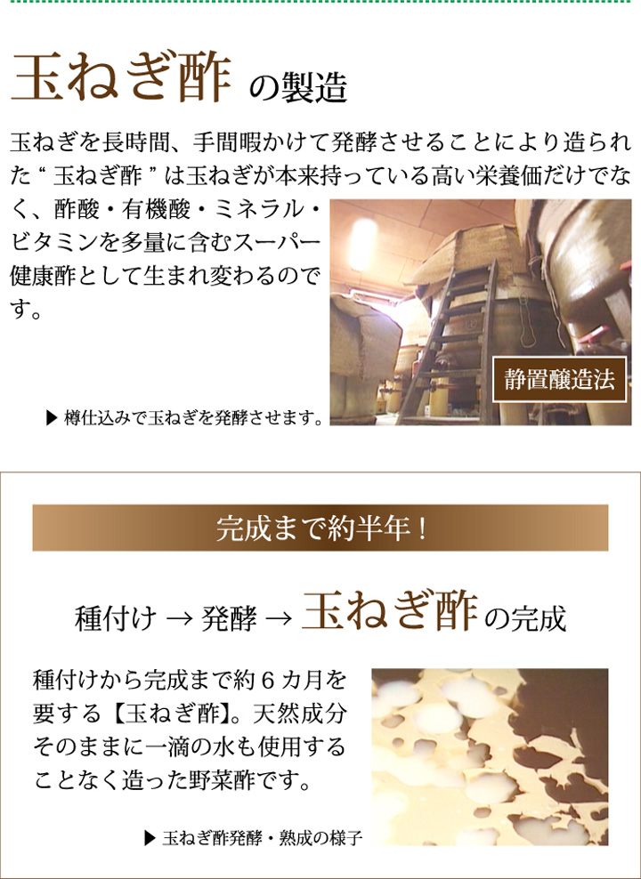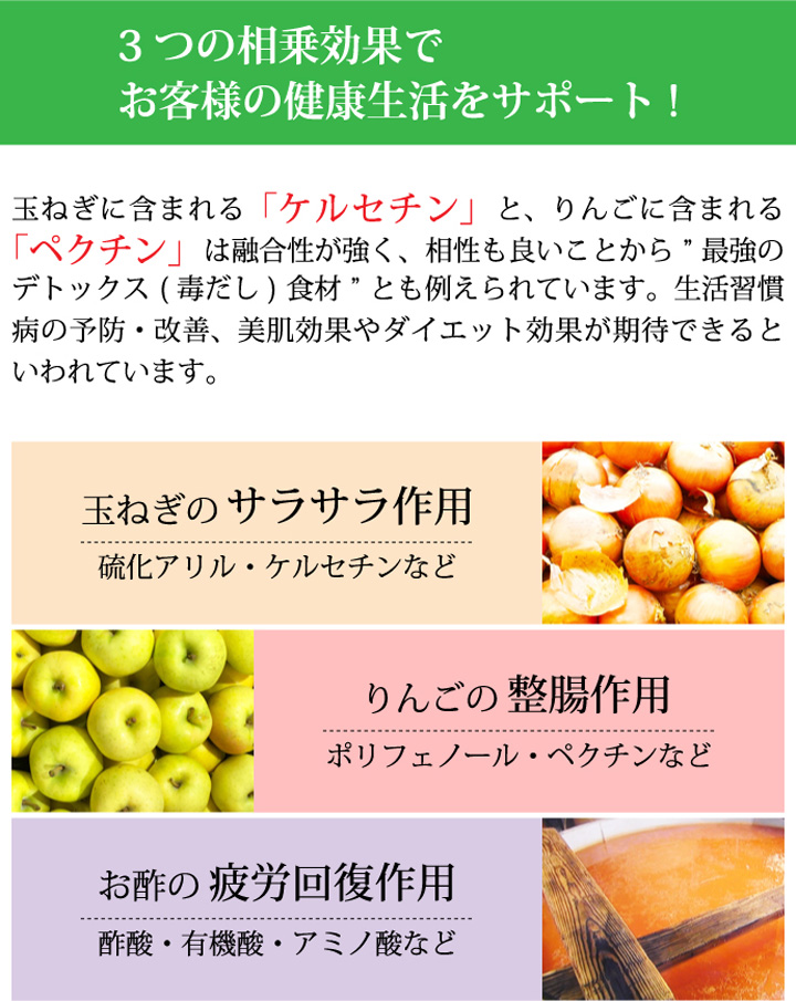 玉ねぎをじっくり時間を掛けて発酵させて出来た「玉ねぎ酢」に、青森県産りんご「王林」を独自の配合でブレンドしました。酢玉ねぎの酸味とりんごの芳醇な甘みがくせになる、身体にも美味しい無添加のケルセチン・ペクチン含有野菜酢です。