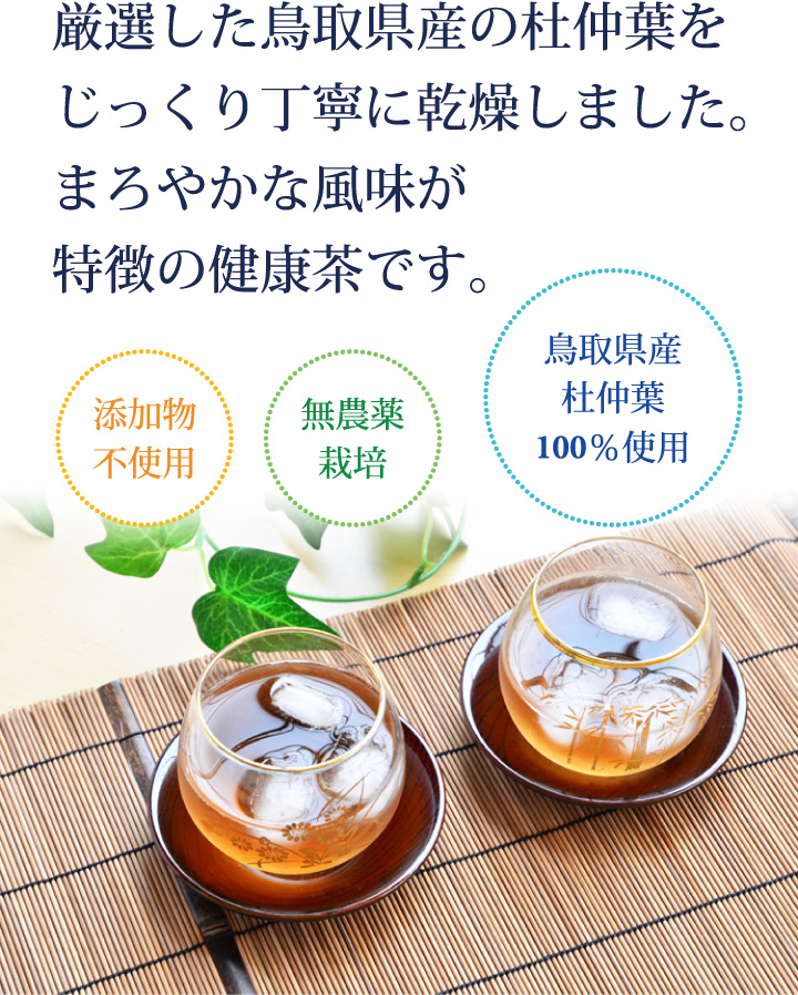 村田食品の杜仲茶は、鳥取県の自然溢れる無農薬の土壌で大切に育てられた「杜仲の葉」を100%使用した健康茶です。厳選した新鮮な茶葉のみを使用。栄養成分が豊富で、且つ国産特有のクセのない風味でどなたにも美味しくいただけます。余分な脂肪やむくみが気になる方へおすすめの健康茶です。