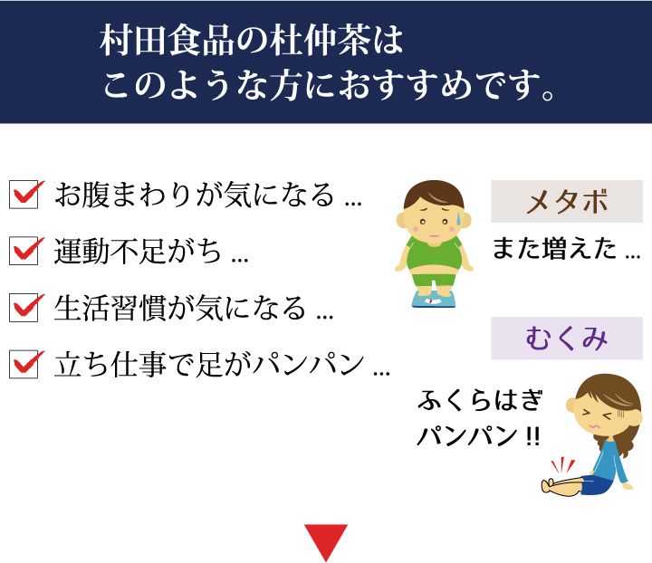 国産無農薬栽培の「杜仲葉」を100%使用しました。さっぱりとした風味が特徴の村田食品の杜仲茶は余分な脂肪やむくみが気になる方へおすすめの健康茶です。
