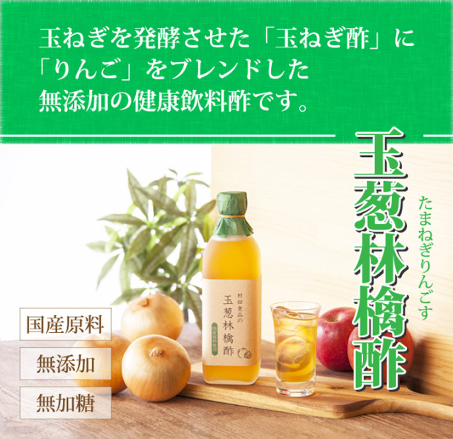 玉ねぎをじっくり時間を掛けて発酵させて出来た「玉ねぎ酢」に、青森県産りんご「王林」を独自の配合でブレンドしました。酢玉ねぎの酸味とりんごの芳醇な甘みがくせになる、身体にも美味しい無添加のケルセチン・ペクチン含有野菜酢です。