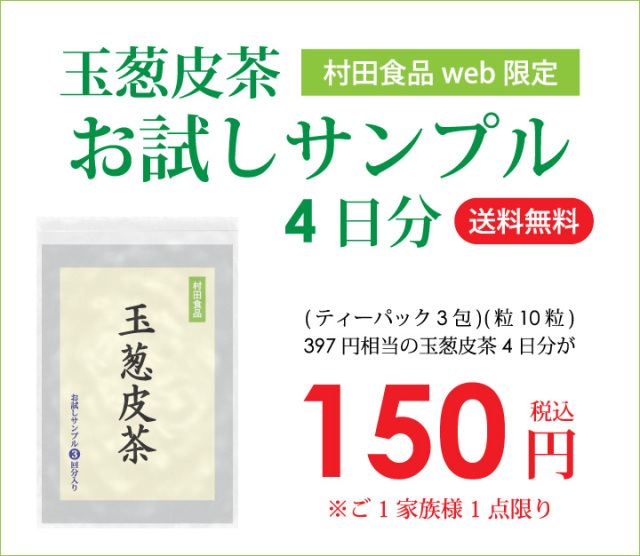 玉葱皮茶 お試しサンプルは、玉葱皮茶(ティーパックタイプ3日分)と、(粒タイプ1日分)のお試しサンプルです。村田食品web特別価格にてご提供いたします。